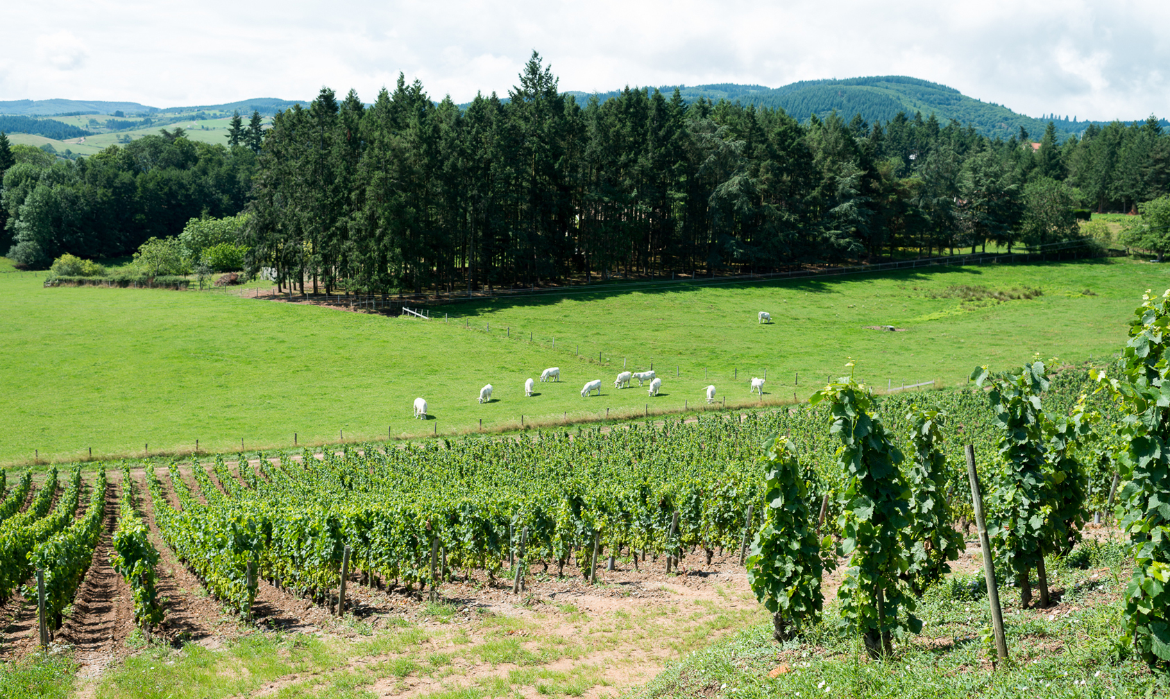 Vines once dominated the Côte Roannaise, but the collapse of viticulture broke the monoculture. With only a fraction of the hectares remaining, vineyards are now scattered among pastures, rotating crops, and woods. The result is far greater biodiversity than in more celebrated regions. The Charolaises also supply the Sérols with organic manure, which they use to make their own compost.